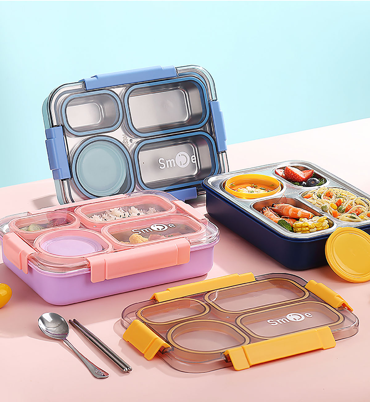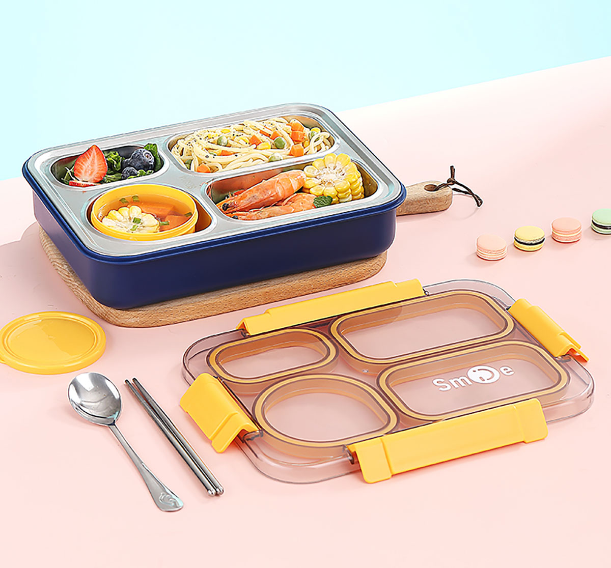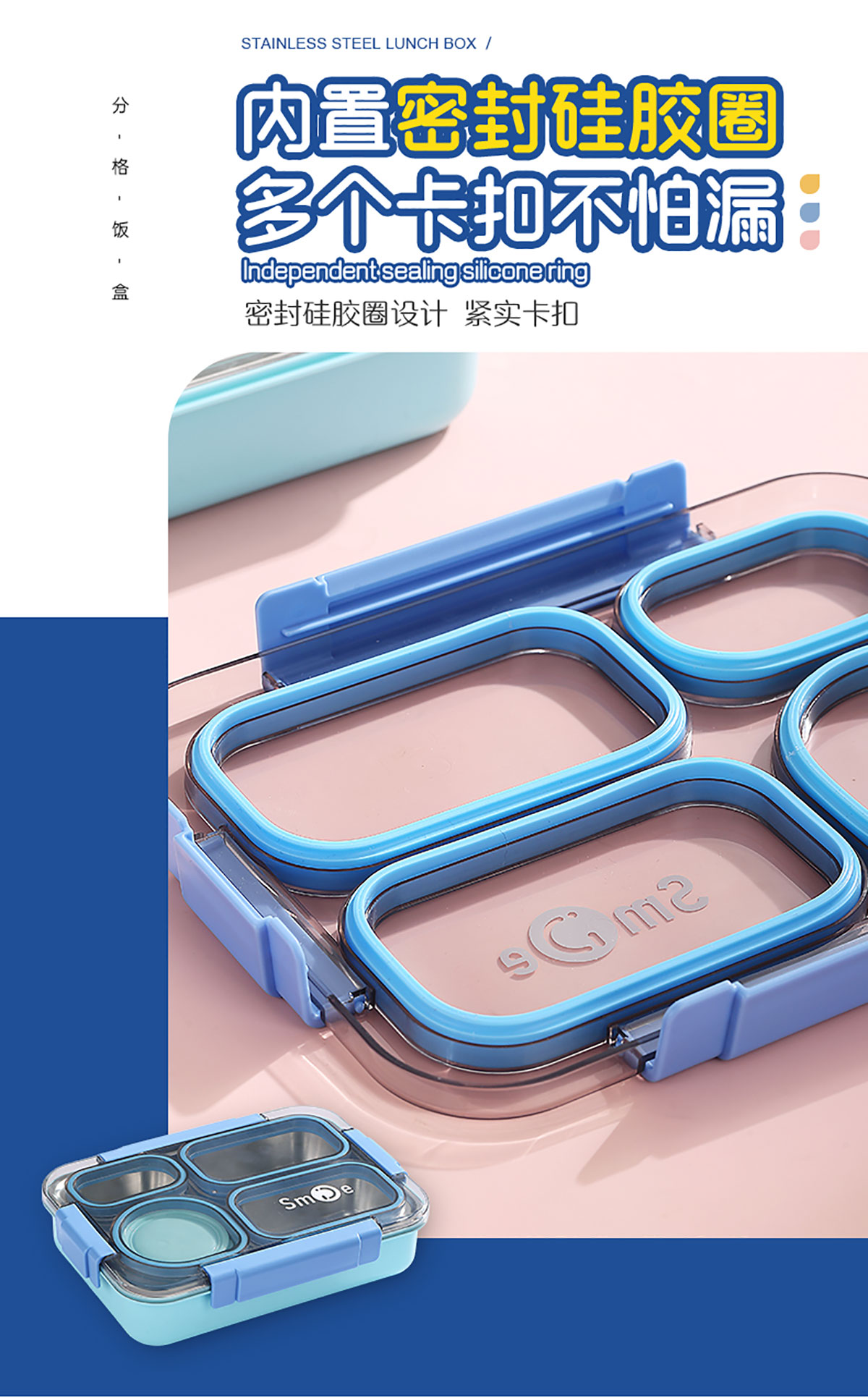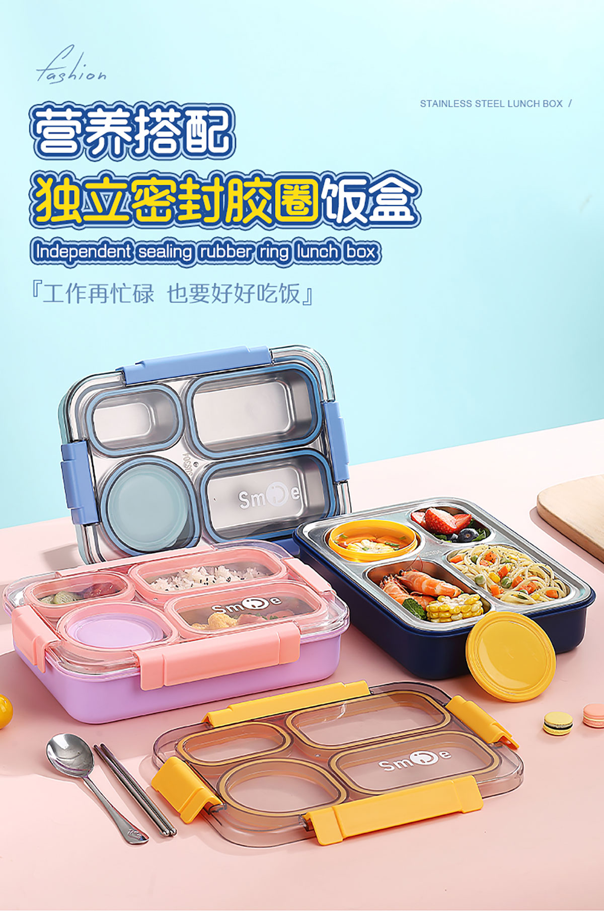 900ml獨(dú)立密封不銹鋼餐盒(4格+PP碗150ml+不銹鋼勺筷)