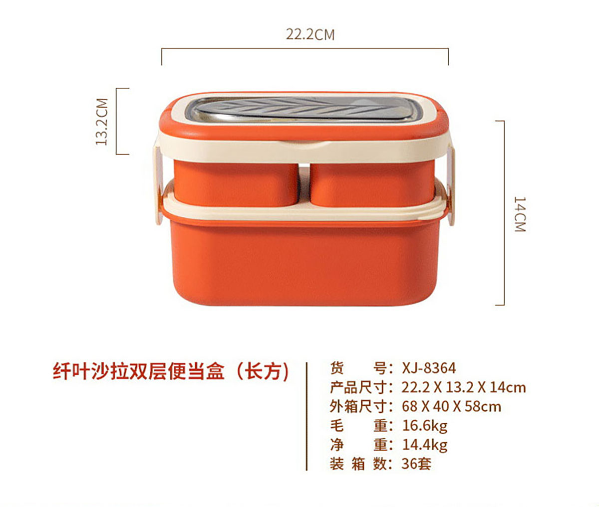 HH-XJ8364(雙層長(zhǎng)方形):222*132*140mm/容量:底1320ml+小格280ml*2