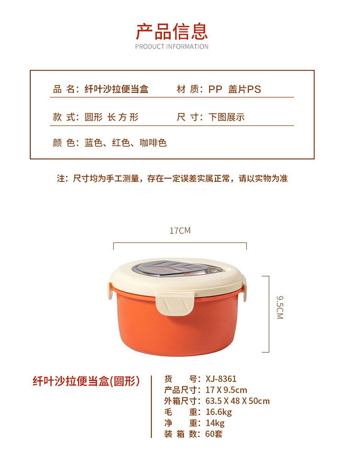 Size: HH-XJ8361(圓形):170*95mm/容量:底600ml+格320ml